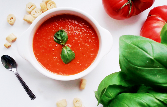 Przepis: Pomidory malinowe przekrojone na pół pieczemy ok. 40 minut razem z bazylią, papryczką chilli, cebulą, 2 ząbkami czosnku i oliwą z oliwek. Ostygnięte pomidory obieramy ze skórki i usuwamy pestki. Wszystko blendujemy i doprawiamy solą i pieprzem. Gotowe! Podajemy z naturalnymi grzankami na gorąco.