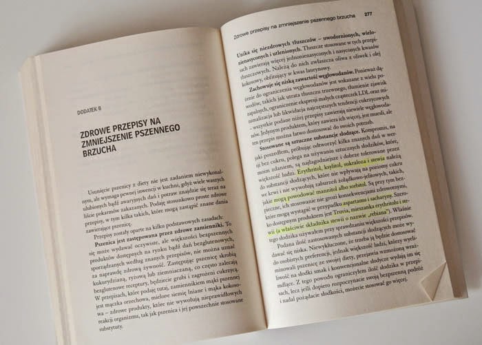 William Davids radzi również jak przejść na dietę bez pszenicy, żeby do niej więcej nie wrócić. Książka oddziałuje bardzo mocno na czytelnika. Mnóstwo przykładów, które podaje autor, popartych dowodami, badaniami naukowymi powoduje, że obieramy taki sam punkt widzenia co autor. Trzeba przyznać, że książka robi niezłe pranie mózgu. Sama po przeczytaniu kilku pierwszych rozdziałów miałam ochotę wyrzucić wszystko co miało chociażby kontakt z pszenicą. Lektura nastawiona jest w 100% anty nie tylko na pszenicę, ale również na inne zboża, a w zasadzie na wszystko co powoduje szybki wzrost cukru we krwi. Chociaż dałam się namówić na okres tygodnia, może dwóch bez pszenicy, obecnie nie zrezygnowałam z niej do końca. Nie mam uczulenia na gluten, po zjedzeniu niewielkiej ilości pszenicy nie odczuwam żadnych dolegliwości. Autor udowadnia, żeby pozbyć się pszennego brzucha należy wyeliminować nie tylko pszenicę, ale wszystkie produkty wywołujące duży wyrzut insuliny. Nie można się z nim nie zgodzić, jednak obwiniać za wszystko pszenicę to duża przesada. Książkę należy traktować (według mnie) z lekkim przymrożeniem oka i nie dać się wkręcić w fanatyzm antypszeniczny. O ile faktycznie nie macie pszennego brzucha, uczulenia na pszenicę i wszelkich objawów opisanych w książce.
