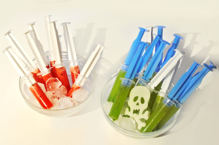 Moja pierwsza propozycja to dwa rodzaje shot’ów, krwiste i radioaktywne. Pyszne shoty ze świeżo wyciskanych soków z owoców, w wersji dla dzieci bez alkoholu, w wersji dla dorosłych z odrobiną wódki.